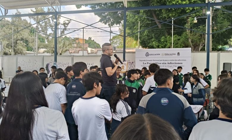 Guanajuato, Gto., 13 de junio de 2025.–   En el marco de la estrategia Súperliga de la Salud, y bajo el lema “El fentanilo te mata. Aléjate de las drogas. Elige ser feliz”, la Secretaría de Educación de Guanajuato (SEG) llevó a cabo la Segunda Jornada Nacional por la Paz y contra las Adicciones en la escuela secundaria “Quanaxhuato”, con la participación activa de estudiantes, docentes y familias.